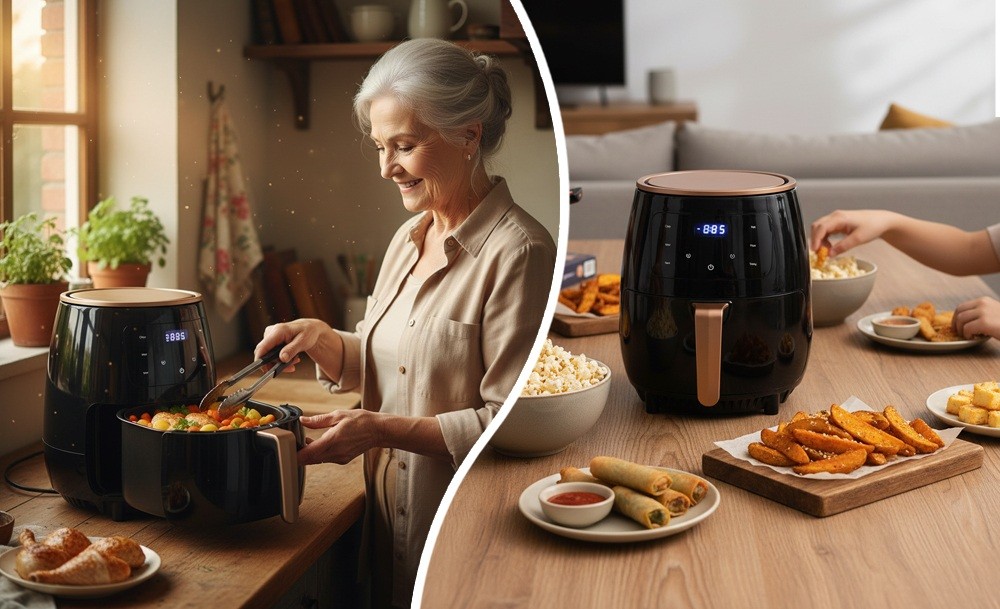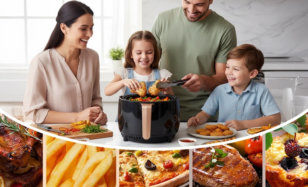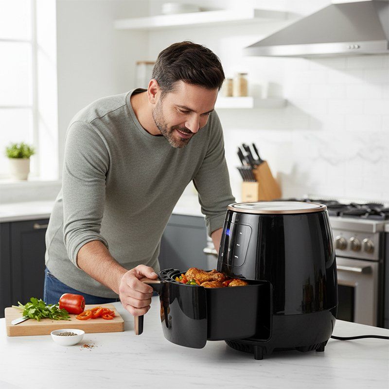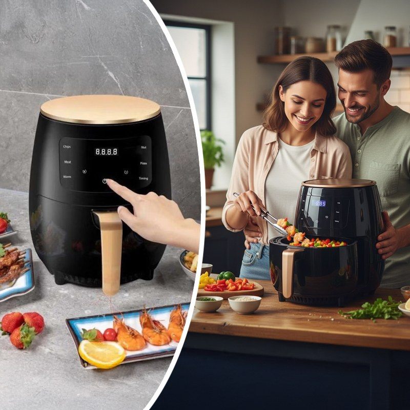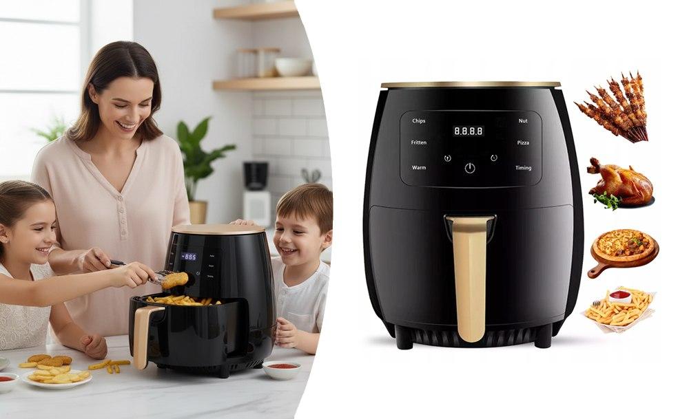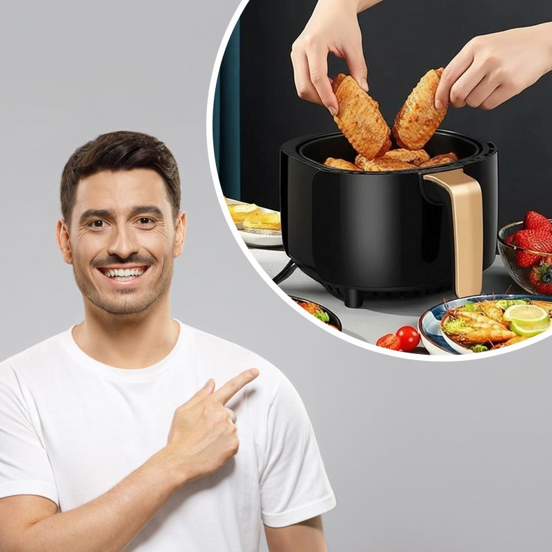 Объем 8 литров позволяет подавать большие порции для всей семьи и гостей. Сенсорное управление делает процесс простым – режим выбирается одним касанием. Жарка, запекание, разогрев – все в одном устройстве. Аэрогриль готовит быстро, легко и по-настоящему вкусно, ведь меньше жира – больше пользы и вкуса.