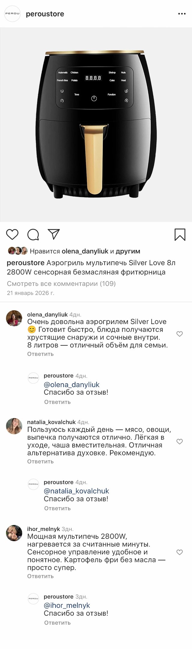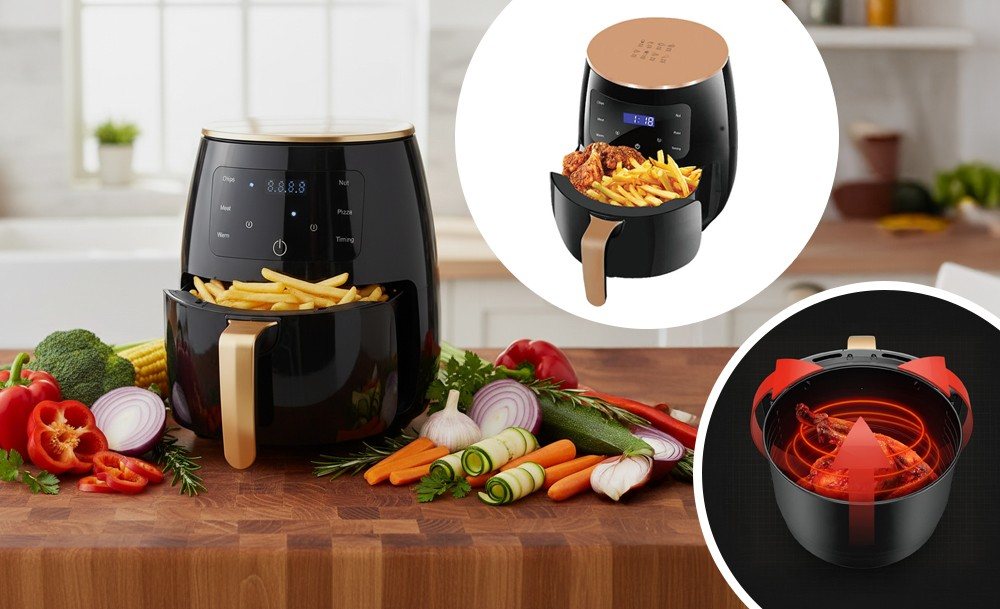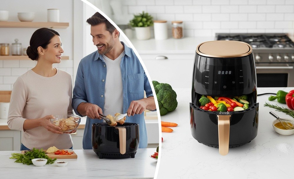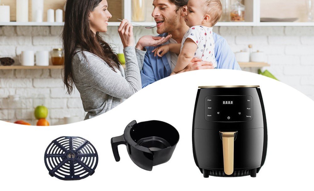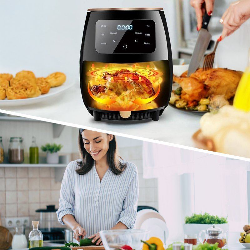 Объем 8 литров позволяет подавать большие порции для всей семьи и гостей. Сенсорное управление делает процесс простым – режим выбирается одним касанием. Жарка, запекание, разогрев – все в одном устройстве. Аэрогриль готовит быстро, легко и по-настоящему вкусно, ведь меньше жира – больше пользы и вкуса.