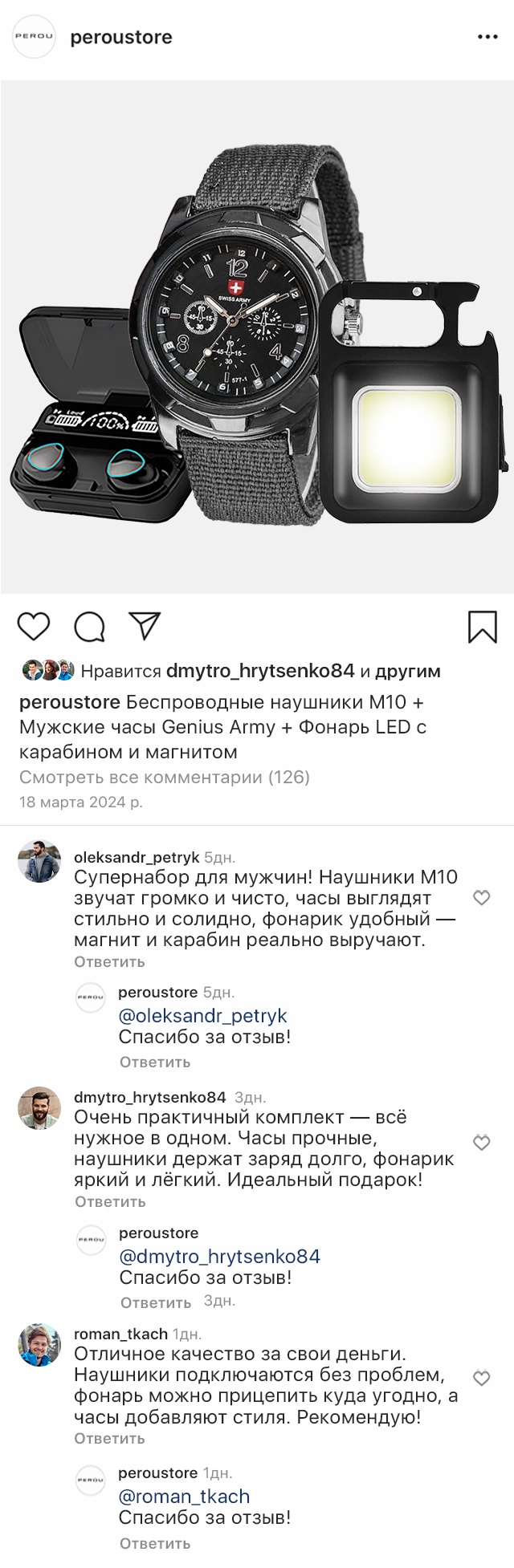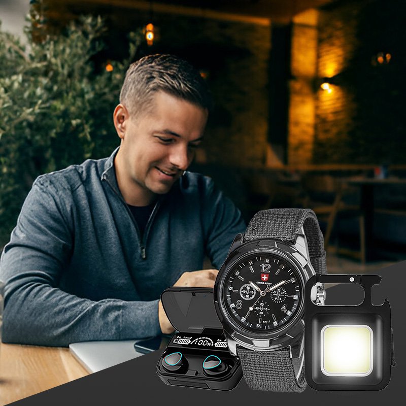 Также в комплект входят мужские часы Genius Army – функциональный аксессуар с крепким ремешком и четким, читабельным циферблатом. Дополняет набор компактный LED фонарь с карабином и магнитом, являющийся удобным источником света и имеющий фиксаторы, что расширяют возможности использования. Набор сочетает практичность и долговечность, необходимые в повседневной жизни.