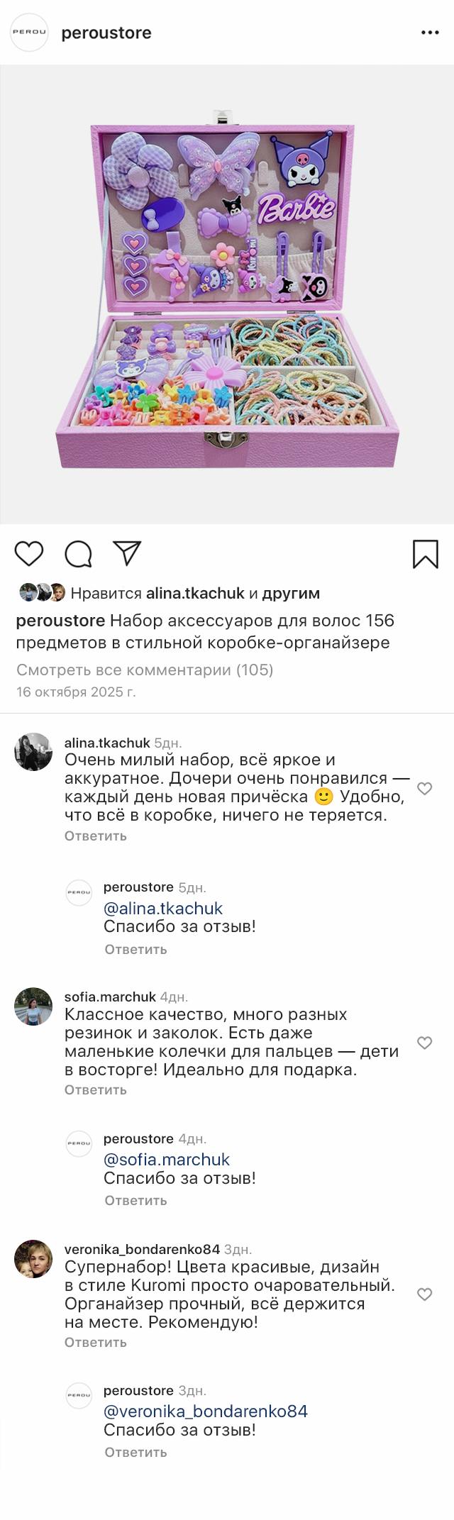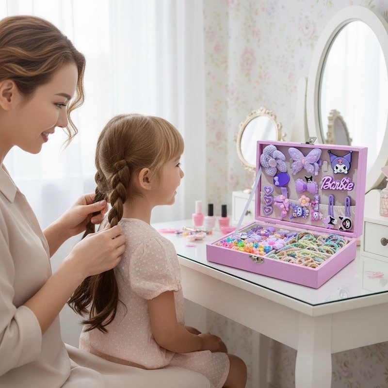 Все аксессуары размещены в многоуровневой коробке. Органайзер помогает поддерживать порядок и удобно хранить мелкие предметы. Набор идеально подходит для повседневного использования, а также для праздничных образов. Он развивает творчество и мелкую моторику при создании причесок. Аксессуары безопасны для детских волос.