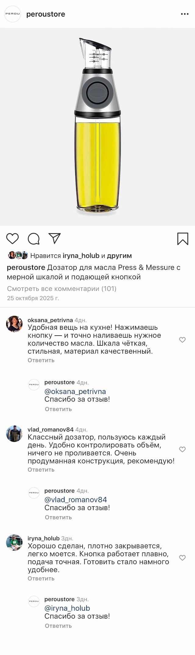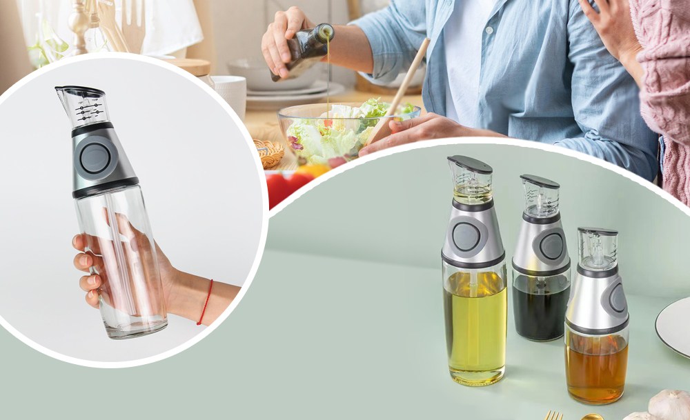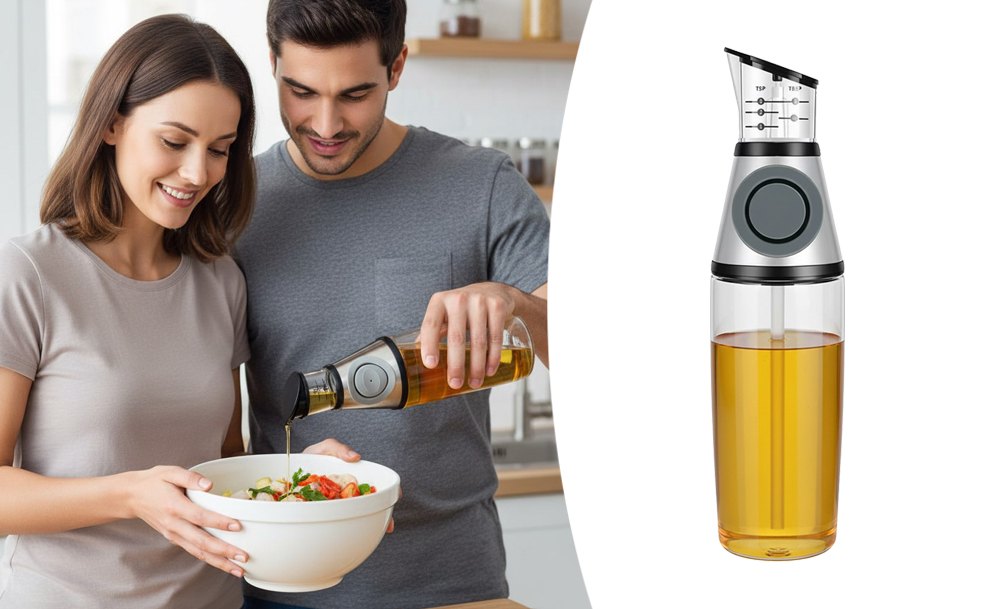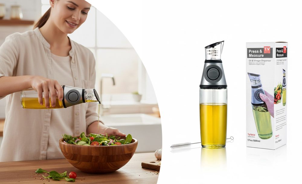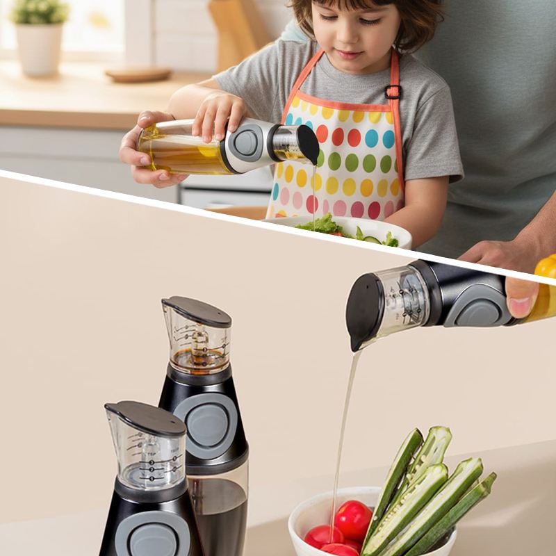 Этот дозатор Press & Measure разработан для точного контроля количества растительного масла во время готовки. Он оснащен встроенной мерной шкалой, позволяющей легко отмерить необходимый объем, например чайную или столовую ложку, без использования отдельных мерных приборов.