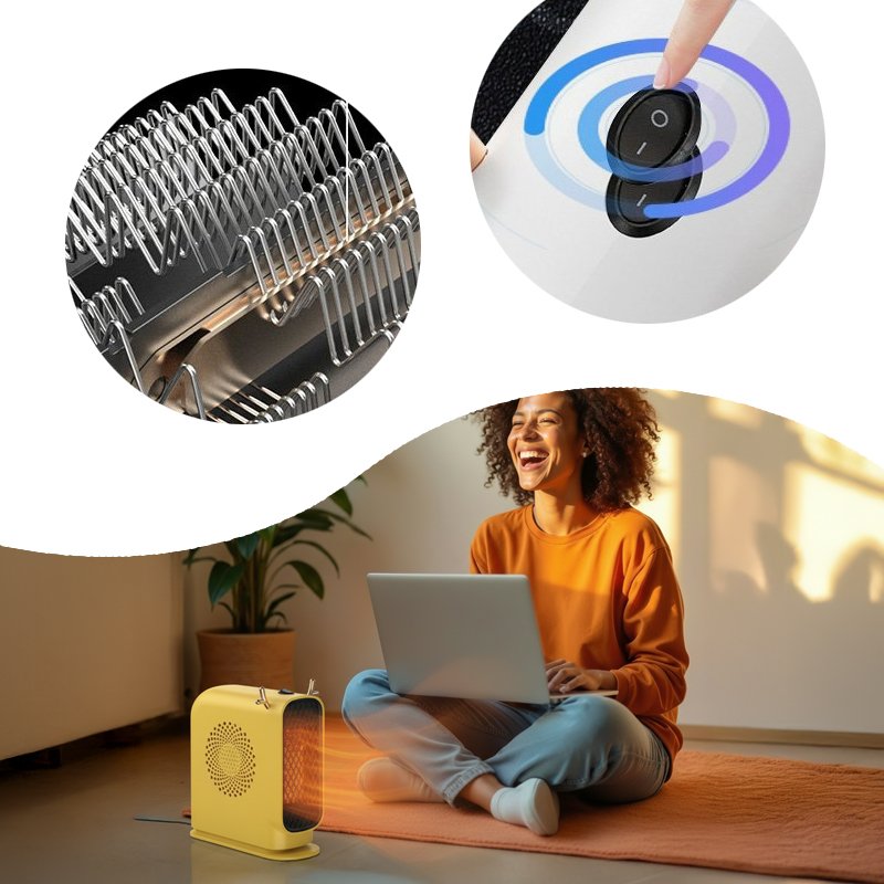Этот мини-обогреватель мощностью 800 Вт быстро создает комфортную зону тепла в вашем личном пространстве. Оснащенный высококачественным керамическим PTC-нагревательным элементом, он сочетает эффективность, экономность и долговечность.