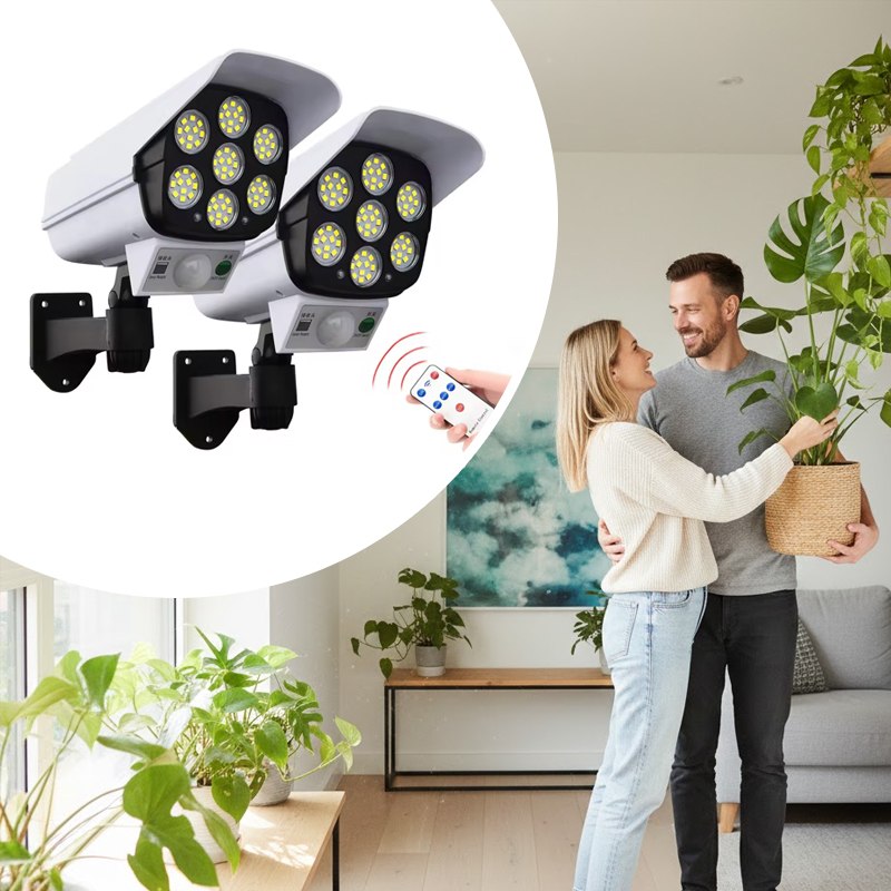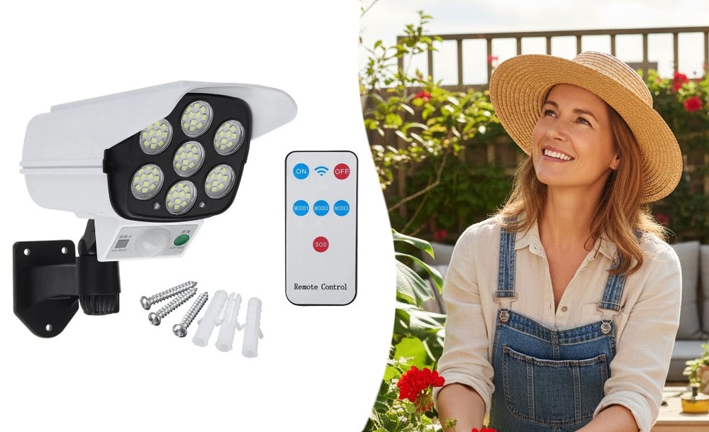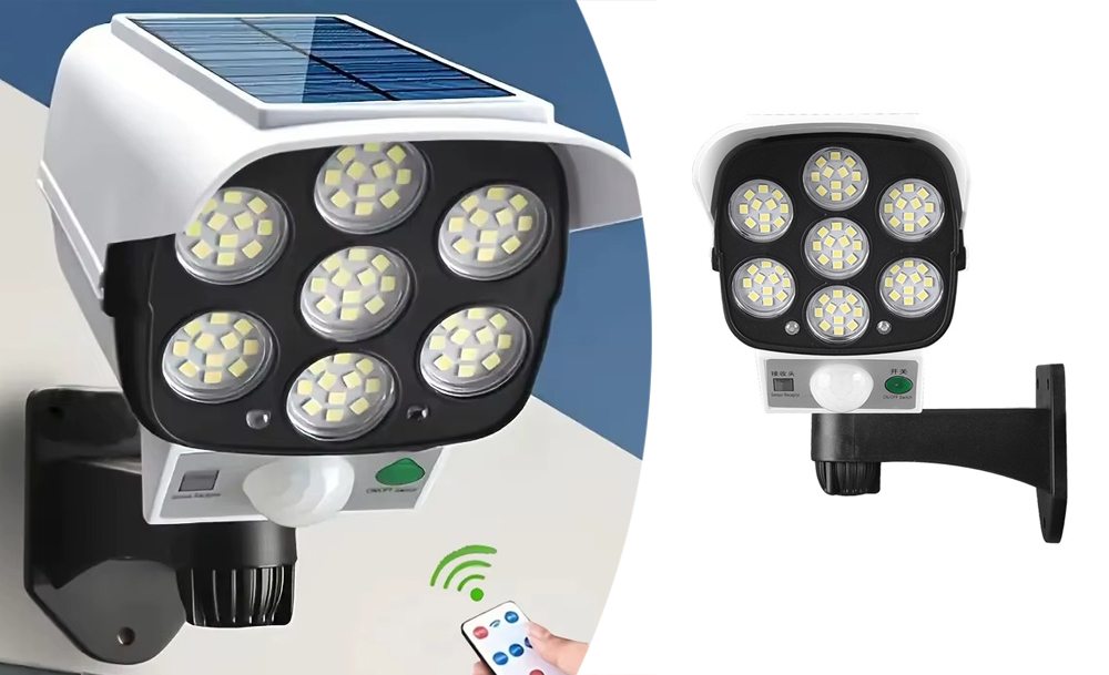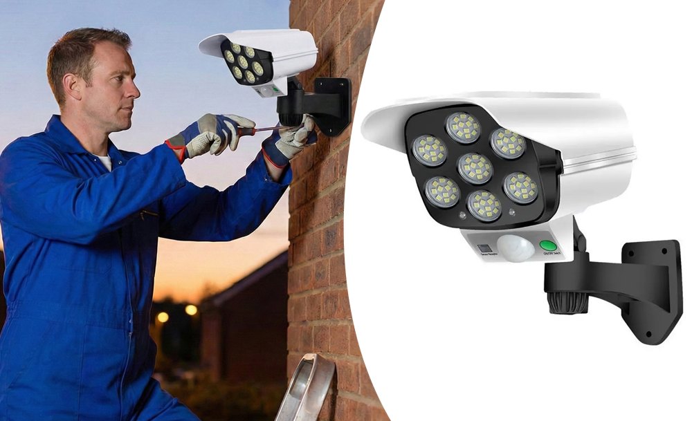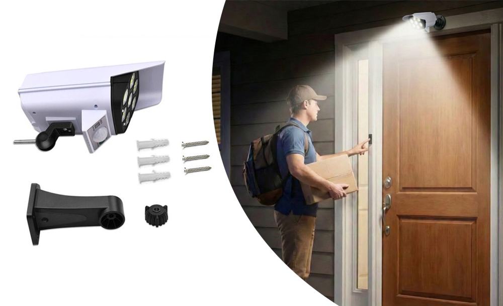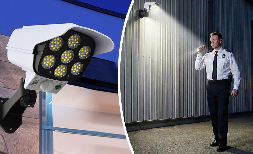 Главная особенность светильника – дизайн в виде камеры видеонаблюдения. Такой внешний вид сам по себе отпугивает нежеланных гостей. Инфракрасный датчик реагирует на движение на расстоянии нескольких метров. Водонепроницаемый корпус позволяет использовать прибор в любую погоду.