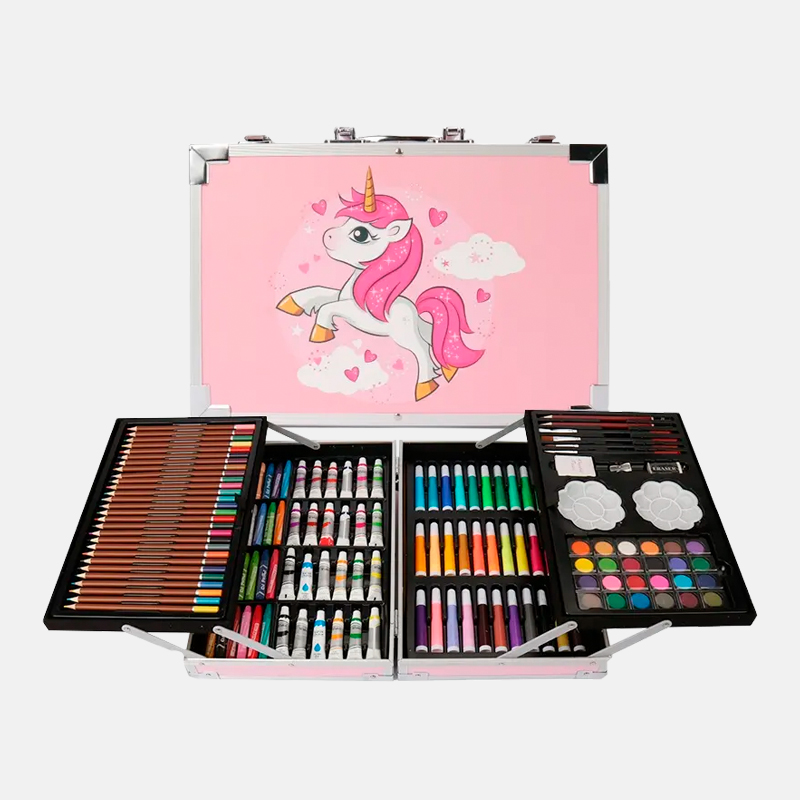 Набор для детского творчества и рисования 145 предметов в алюминиевом чемодане единорог в нем есть 145 предметов на все случаи: несколько видов карандашей, фломастеры, краски, ребенок сможет попробовать все стили прорисовки, при этом вы не потратите лишние деньги.