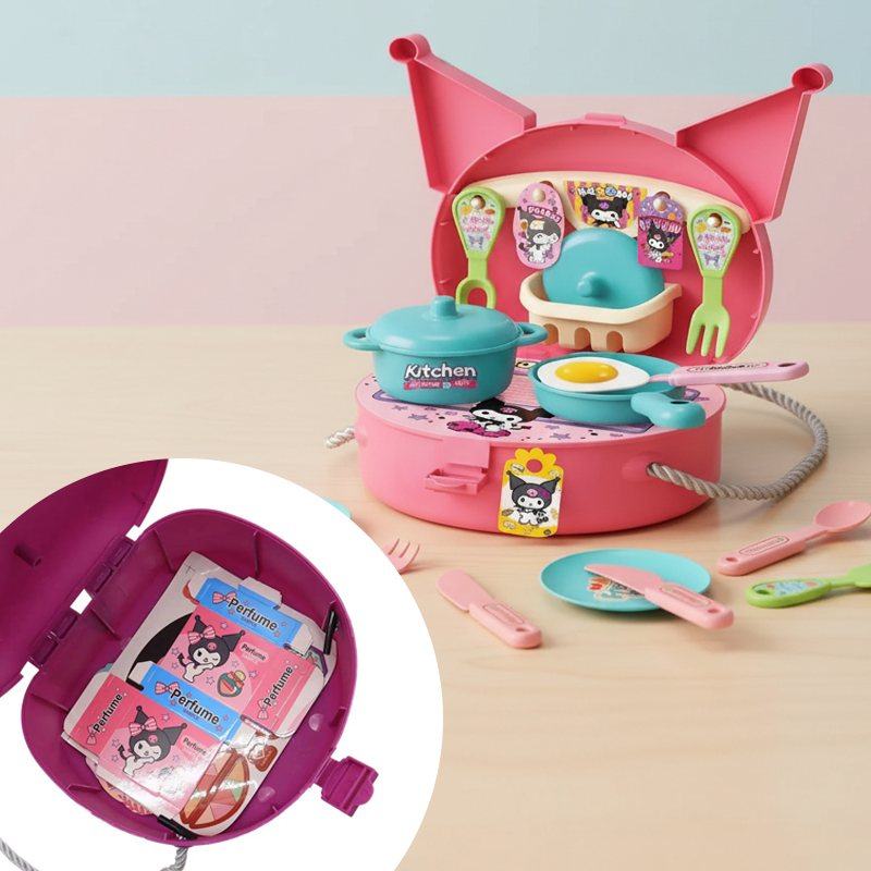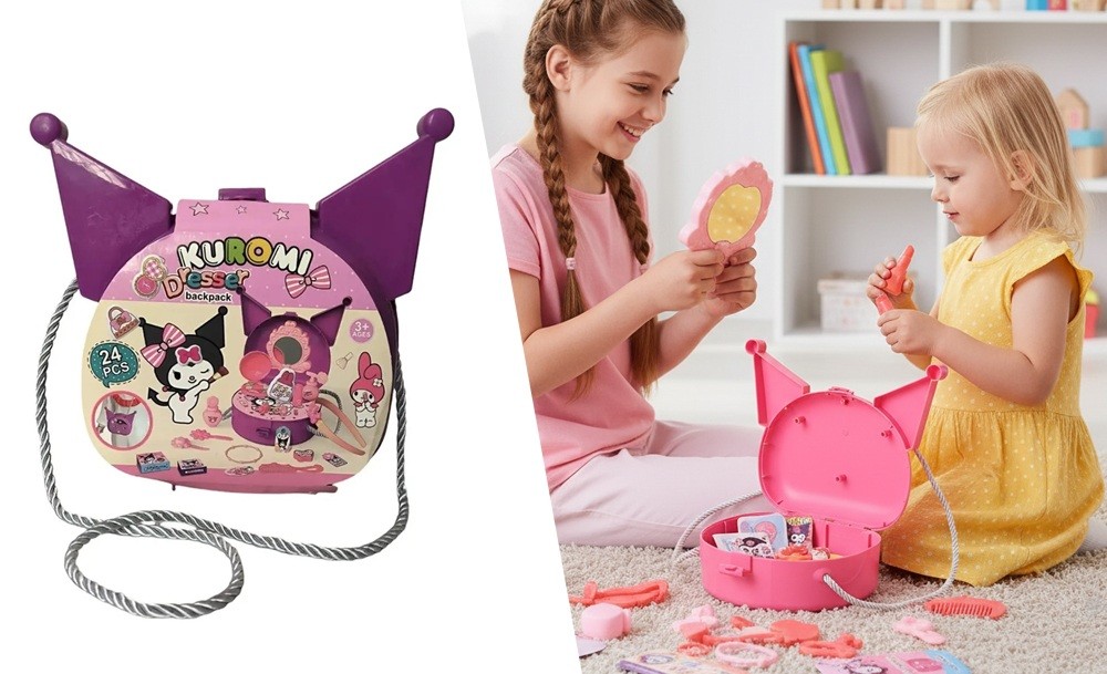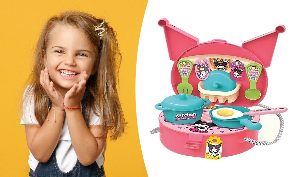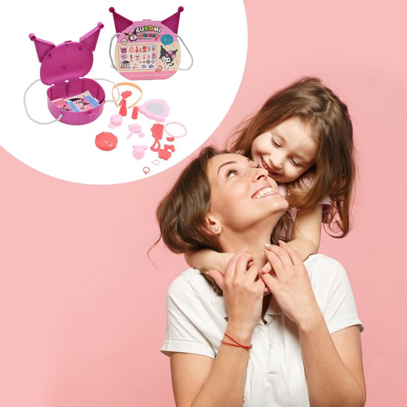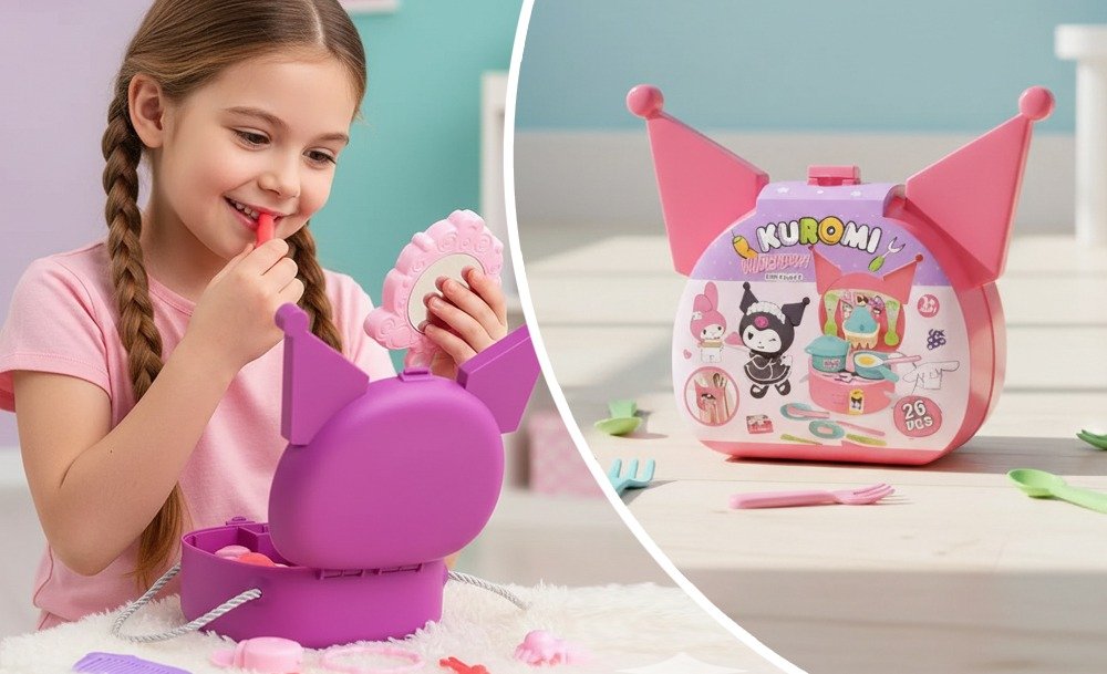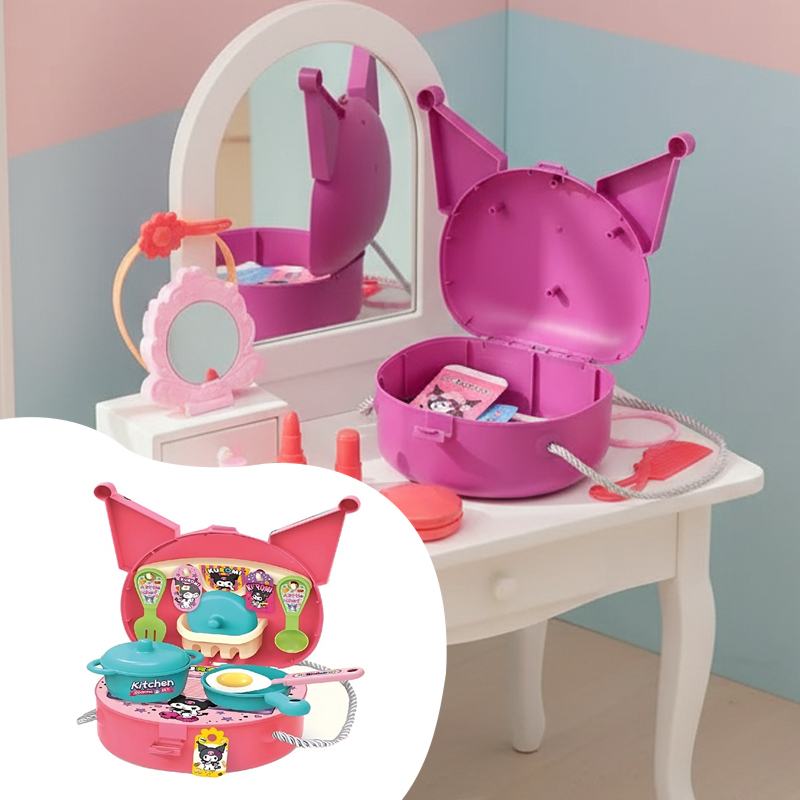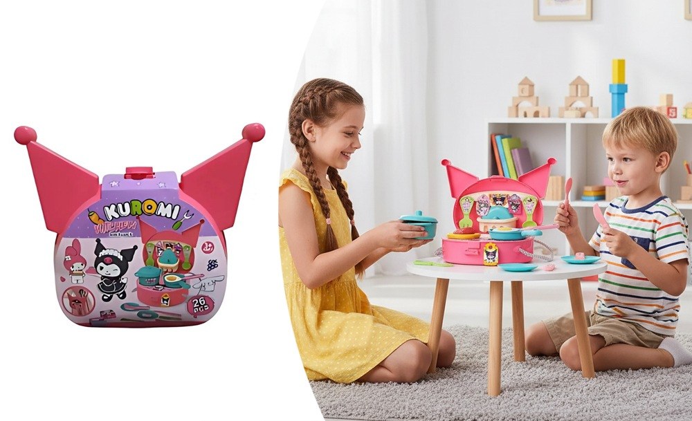 Набор для творчества Kuromi из 26 предметов — это компактный и увлекательный комплект для маленьких детей. В удобном чемоданчике в форме Kuromi может находиться либо мини-кухня с посудой и аксессуарами, либо набор для макияжа для девочек.