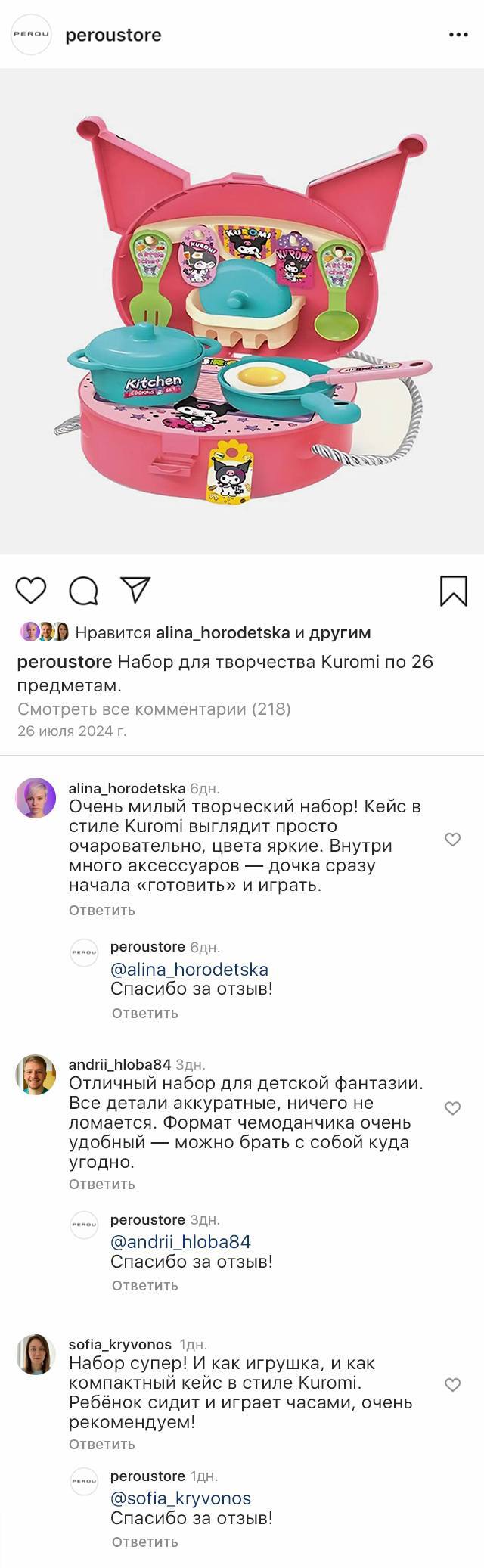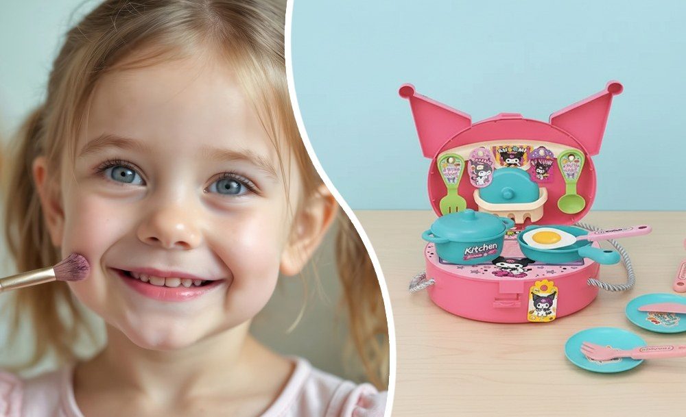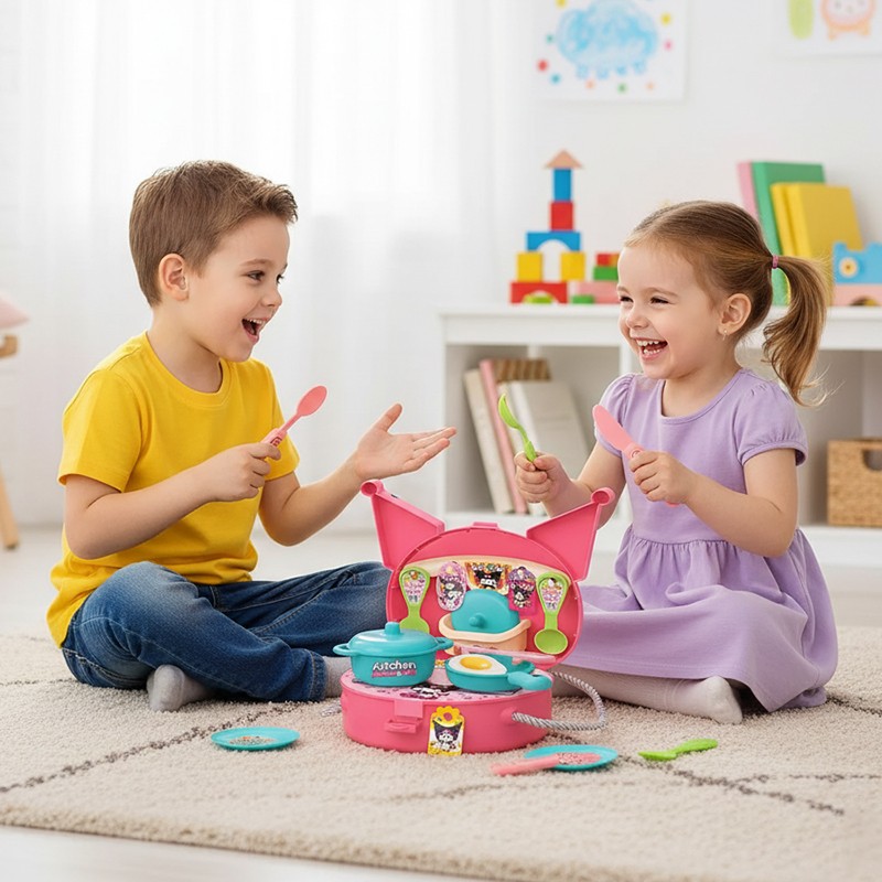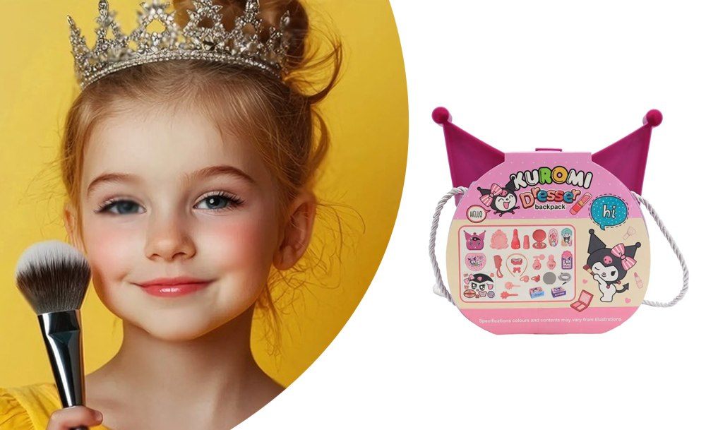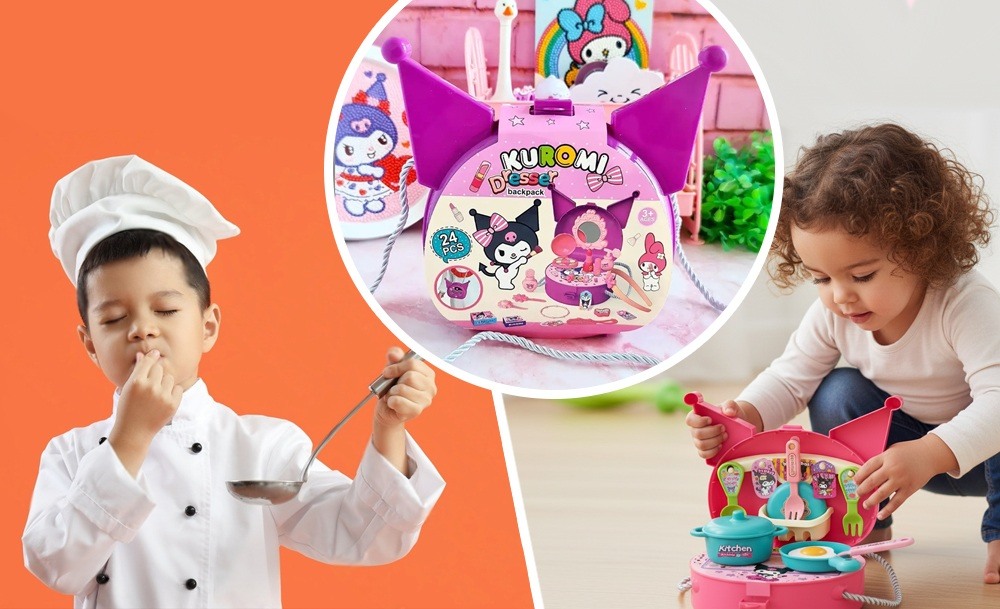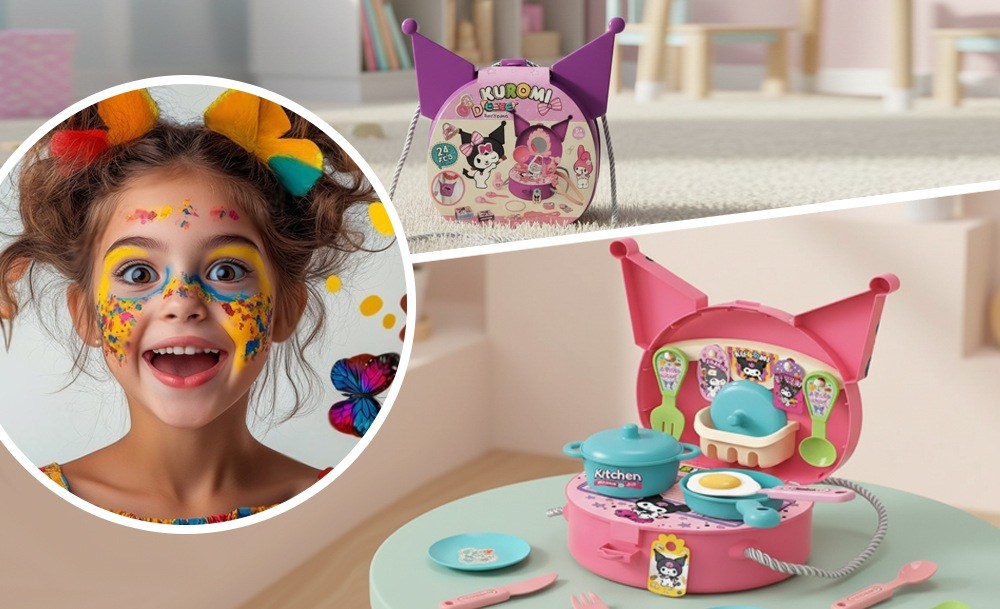 Набор для творчества Kuromi из 26 предметов — это компактный и увлекательный комплект для маленьких детей. В удобном чемоданчике в форме Kuromi может находиться либо мини-кухня с посудой и аксессуарами, либо набор для макияжа для девочек.