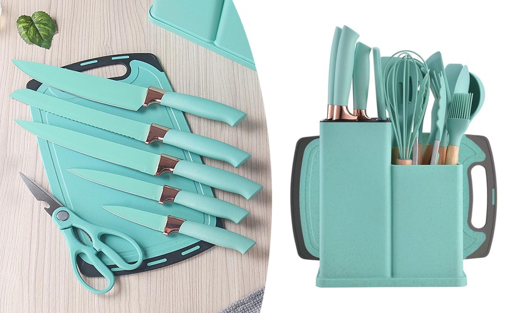 Набор кухонных принадлежностей на 19 предметов: силиконовые приборы + набор ножей + доска для нарезки