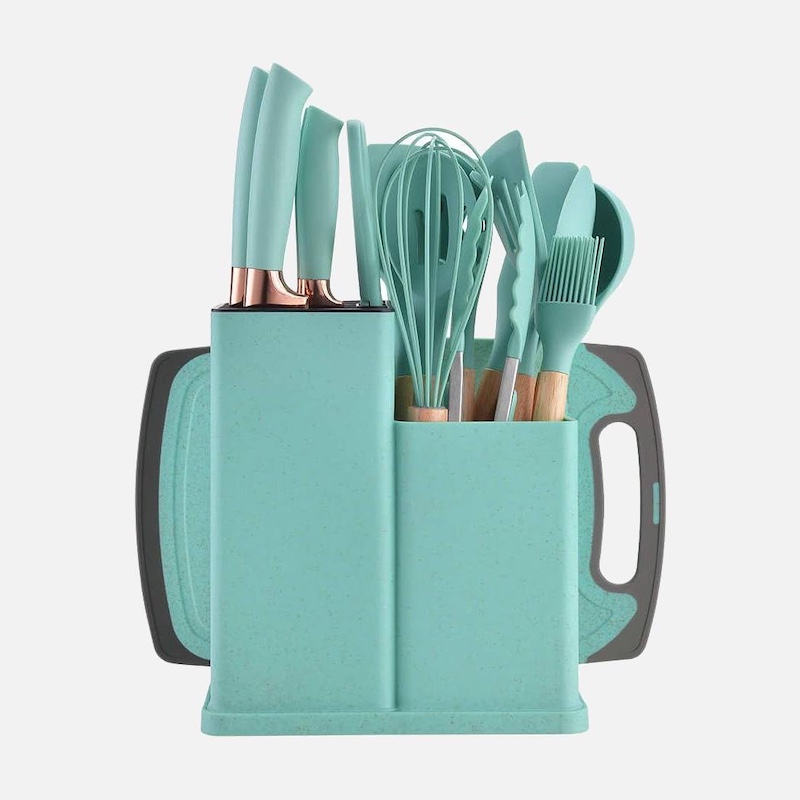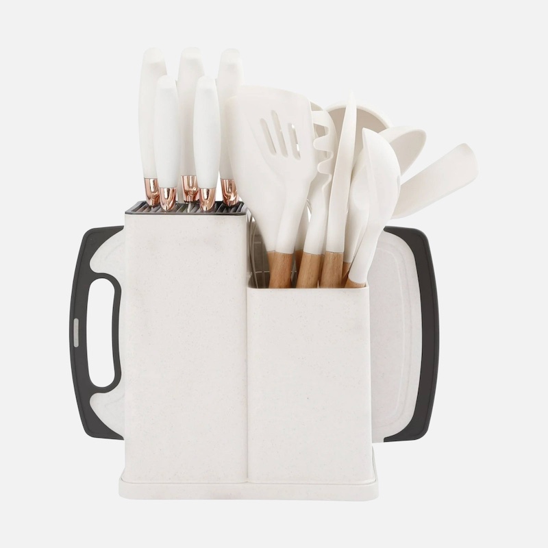 Набор включает в себя не только стандартные кухонные инструменты, такие как лопатки, ложки и веник, но и кухонные ножи, ножницы и доску для нарезки, что делает его универсальным решением для любых кухонных задач.