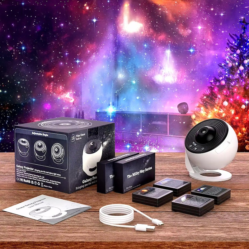 Его особенности включают проекции галактики Андромеды, Млечного Пути, планет нашей солнечной системы и других удивительных изображений. К проектору прилагаются 12 сменных картриджей, а также картридж в виде космонавта на ракете с функцией ночной подсветки.