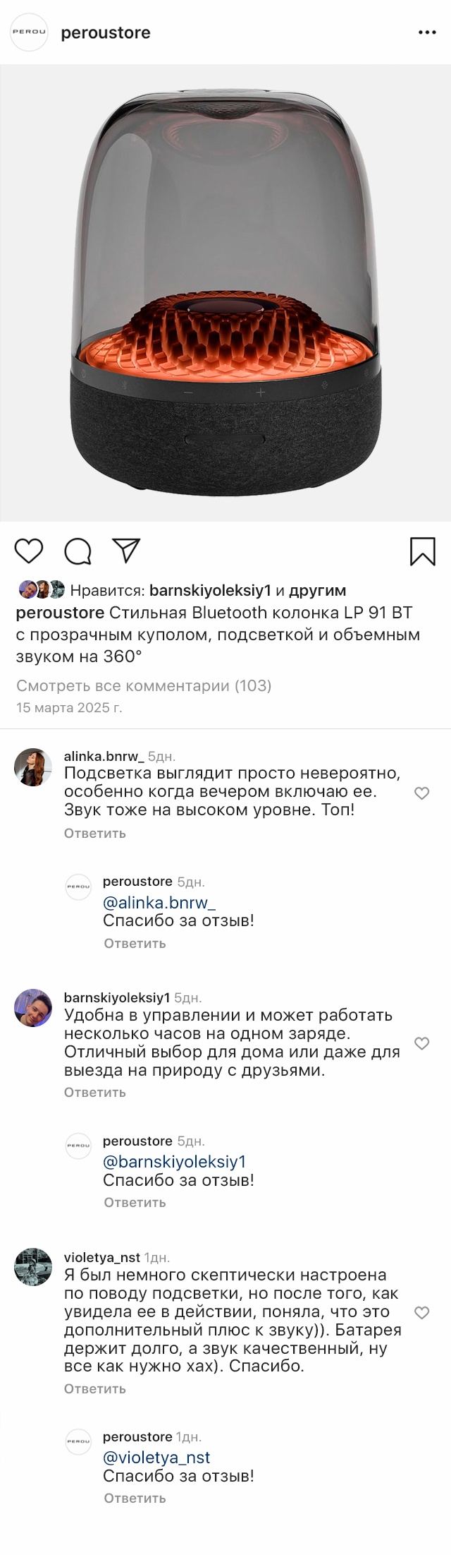 Стильная портативная колонка LP 91 BT наполняет пространство динамичным звуком и яркими световыми эффектами. Объёмное звучание на 360° создаёт музыкальное погружение — дома или на природе. LED-подсветка меняет цвета и дарит атмосферу праздника. Колонка радует модным дизайном, приятным на ощупь корпусом и надёжной сборкой.