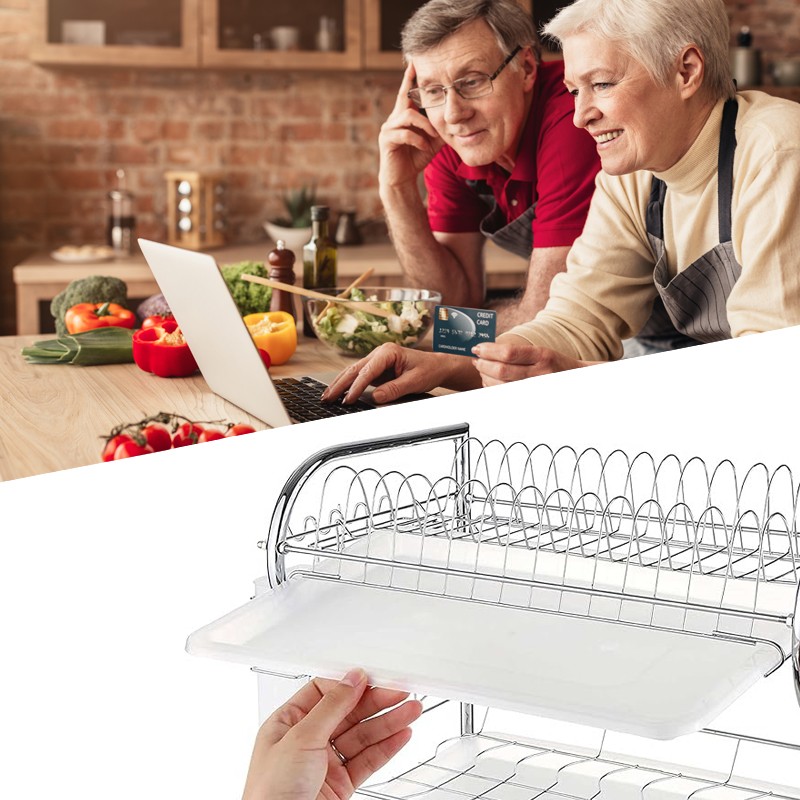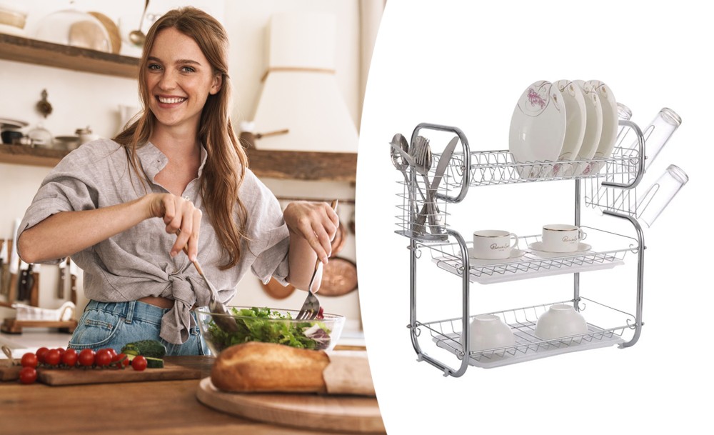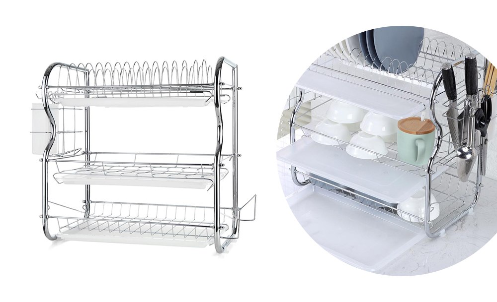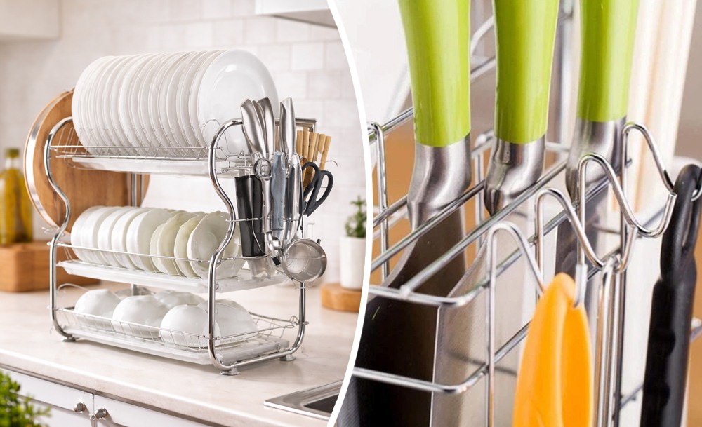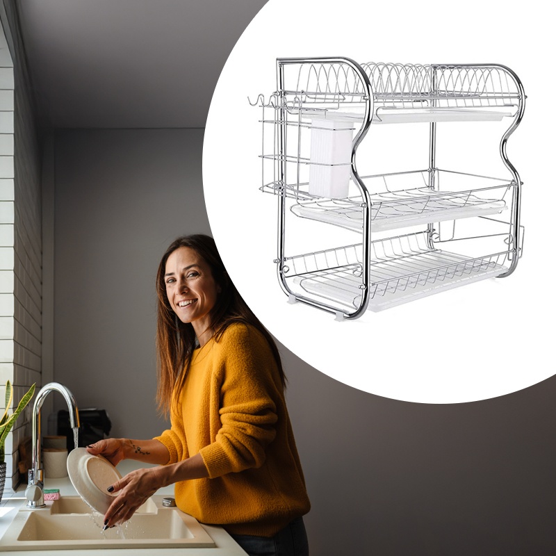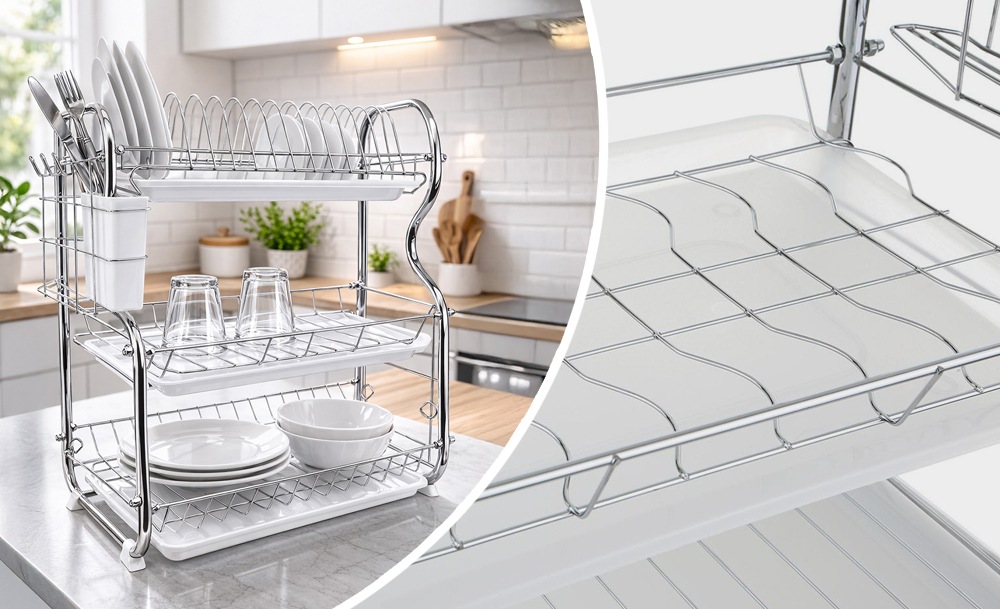 Трехъярусная сушилка-органайзер для посуды и столовых приборов – практичное решение для современной кухни. Многоуровневая конструкция позволяет компактно разместить тарелки, чашки, миски и столовые приборы, экономя пространство на столешнице.