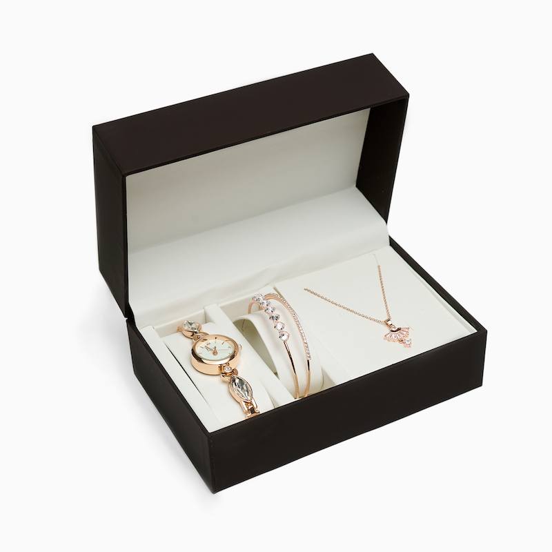 Женский подарочный набор представлен в разных вариантах – часы, двойной тонкий браслет и дополнительный браслет или подвеска на цепочке. Небольшие часики с белым циферблатом на оригинальном браслете создадут утонченный образ.