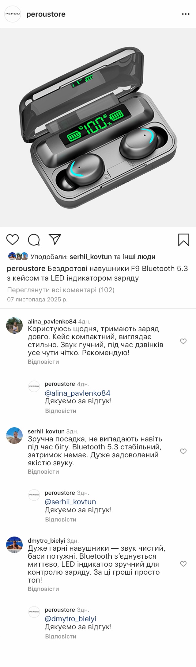 Навушники F9 пропонують стабільне бездротове з’єднання завдяки технології Bluetooth 5.3. Вони забезпечують чистий звук для прослуховування музики та спілкування. У комплект входить зарядний кейс, який слугує для зберігання та поповнення енергії.