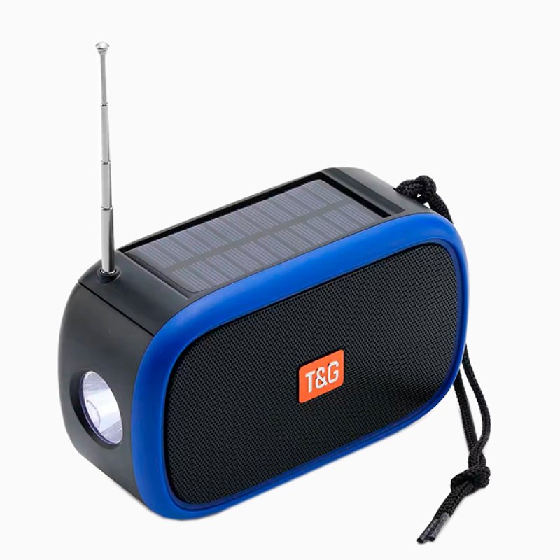 Bluetooth-колонка TG632 з радіо, ліхтарем, сонячною батареєю та гучномовцем – це універсальна система, що поєднує в собі якісний звук та яскраве освітлення. Вбудований акумулятор заряджається через кабель USB або сонячну панель, розташовану на корпусі зверху.
