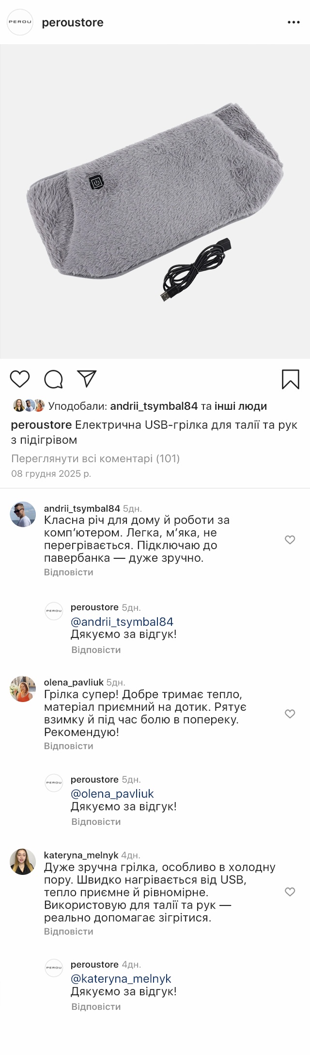 Грілка працює від будь‑якого USB‑джерела – ноутбука, адаптера, повербанка, тому її можна використовувати як вдома, так і на роботі, а також брати у поїздки. Компактна, легка та універсальна, вона перетворює холодні дні на комфортну атмосферу та дарує відчуття затишку.