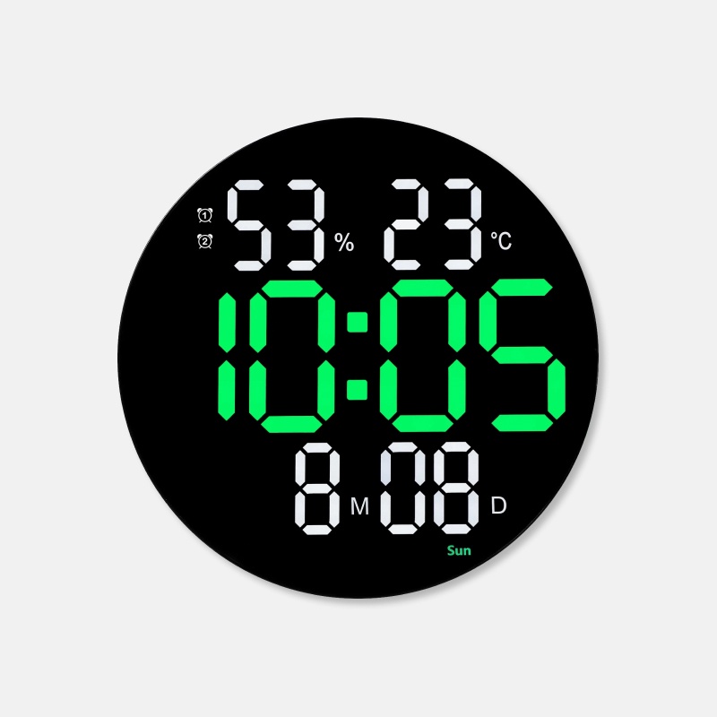 Круглий настінний годинник 3813L, виконаний у чорному корпусі з яскравим підсвічуванням великих цифр, забезпечує зручність використання у будь-якому інтер’єрі. Пристрій одночасно показує час, дату, день тижня, температуру та вологість повітря, дозволяючи завжди бути в курсі ключової інформації.