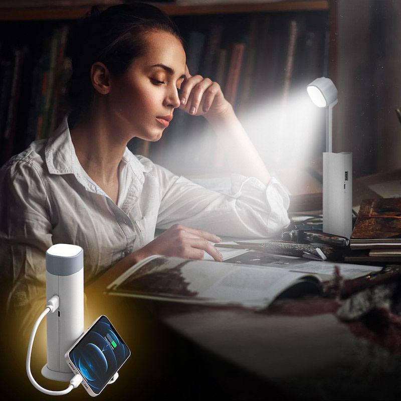 Підставка лампи оснащена упором, на якому можна закріпити телефон або планшет, щоб зручно переглядати екран, звільнивши руки. На корпусі лампи знаходиться роз’єм для її заряджання та USB-порт, через який можна заряджати смартфон й інші гаджети.