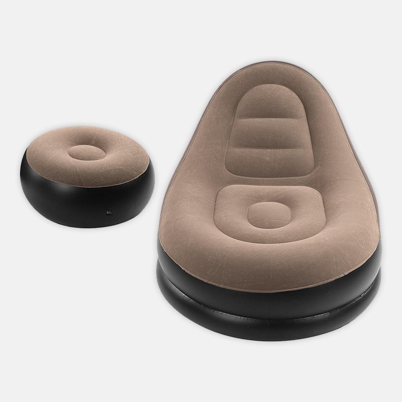 Надувне крісло з пуфиком AIR SOFA виготовлене із сучасних та високоякісних матеріалів. Верхня частина крісла та пуфика має флоковане покриття, м’яке та приємне на дотик. Надувне крісло AIR SOFA – чудовий вибір для Вашого відпочинку. З цим надувним кріслом Ви зможете повністю розслабитись.