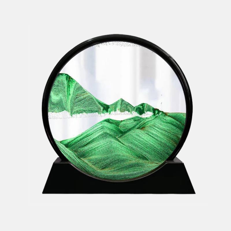 Рух піску трансформується в абстракції, що надихаються гірськими видами, долинами, пустелями та навіть теракотовими ділянками. Коли пісок повністю стікає, легко повернути картину будь-яке інше положення, оскільки вона кругла і легко відокремлюється від основи.
