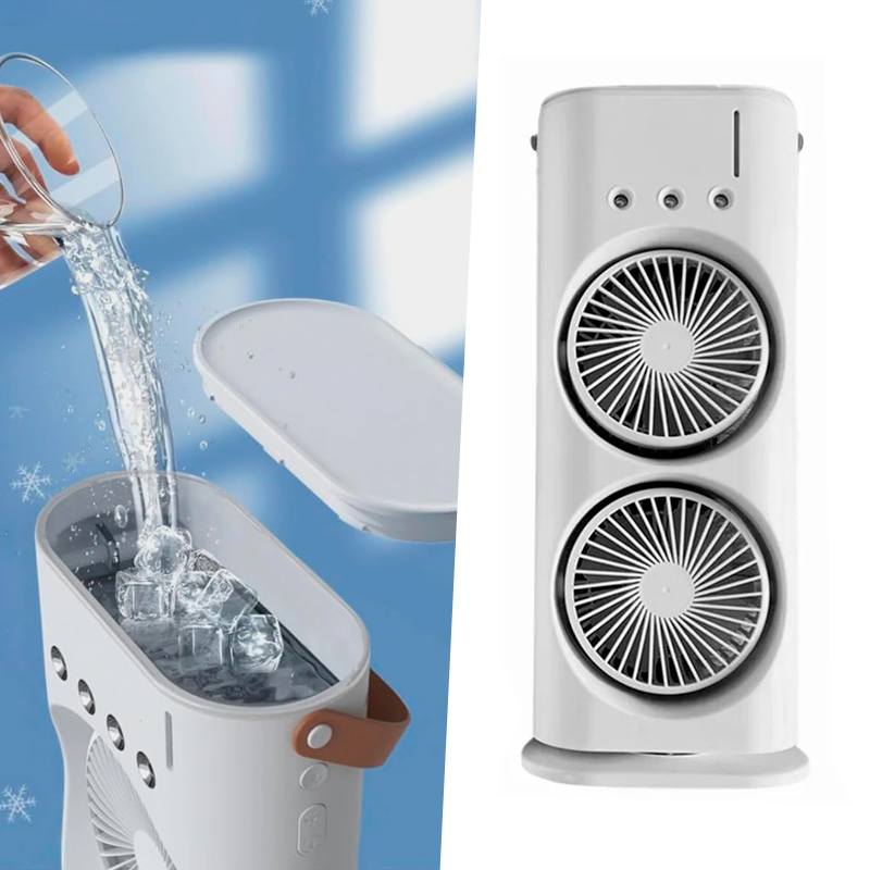 Портативний подвійний вентилятор-кондиціонер із яскравою LED-підсвіткою та функцією розпилення водяного туману забезпечує ефективне охолодження в будь-яких умовах. Ідеально підходить для зручного використання вдома, в офісі або на природі — легкий, компактний та зручний у щоденному користуванні.