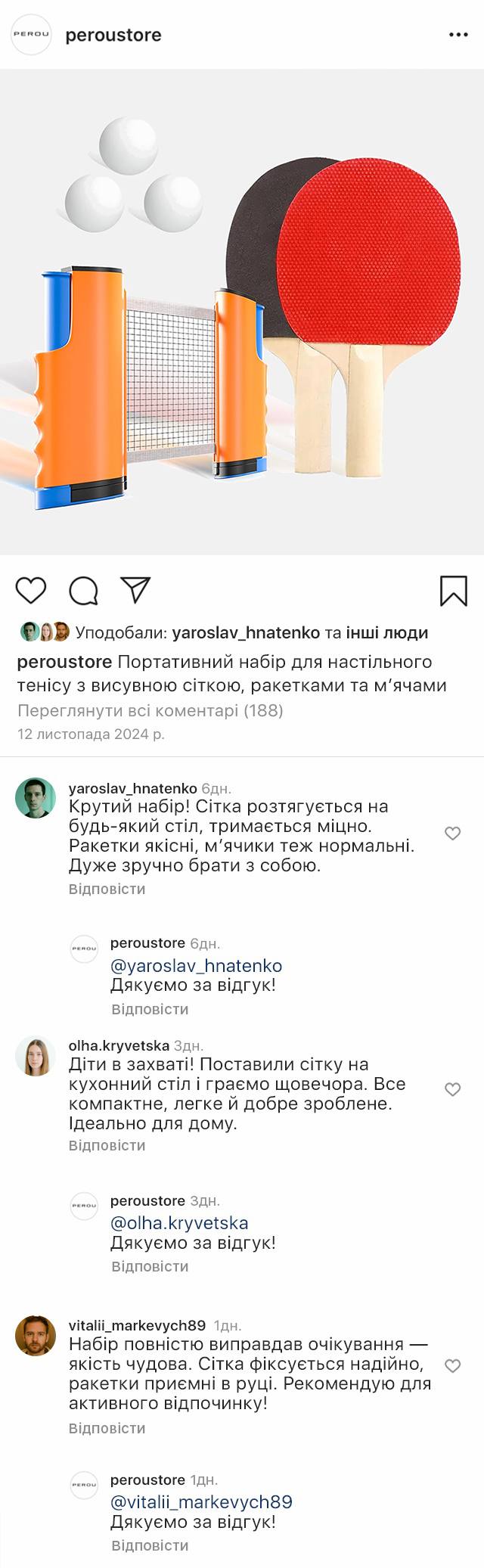 Портативний набір для настільного тенісу з висувною сіткою, ракетками та м’ячами — це зручний комплект, який дозволяє влаштувати гру в пінг-понг у будь-якому місці. Сітку можна швидко розгорнути на будь-якій підходящій поверхні. Вона легко фіксується і так само просто складається назад.