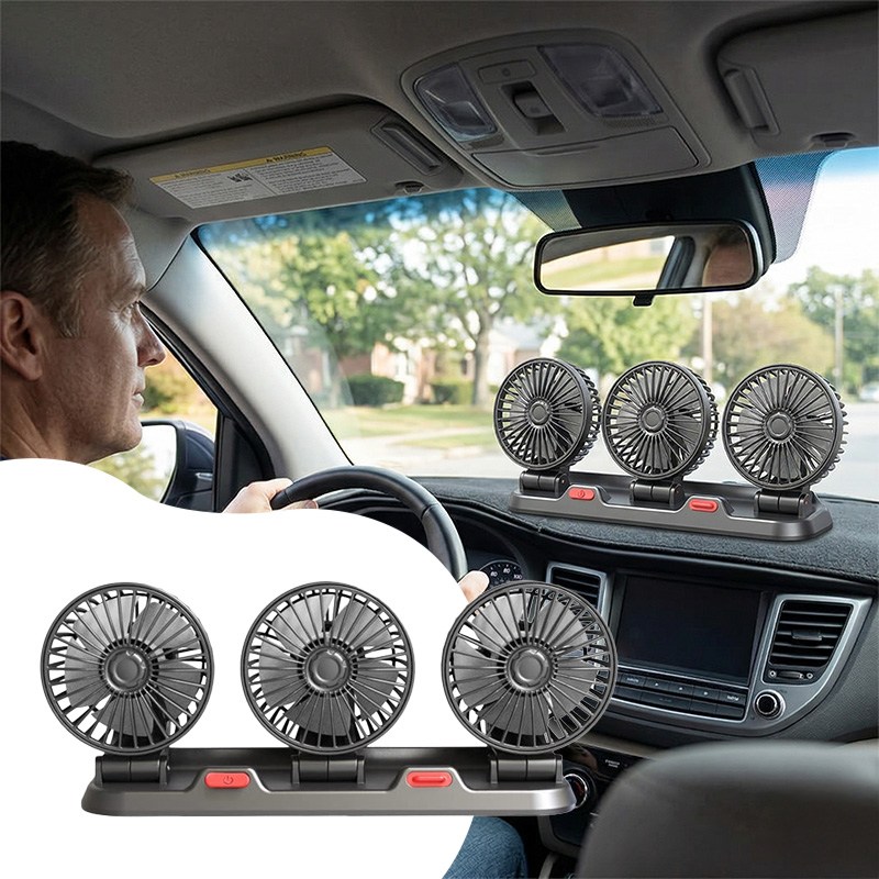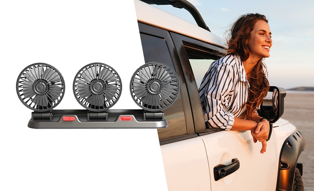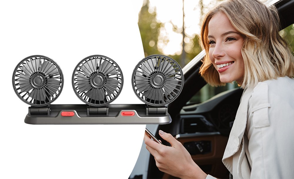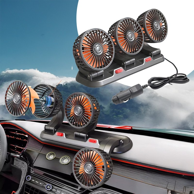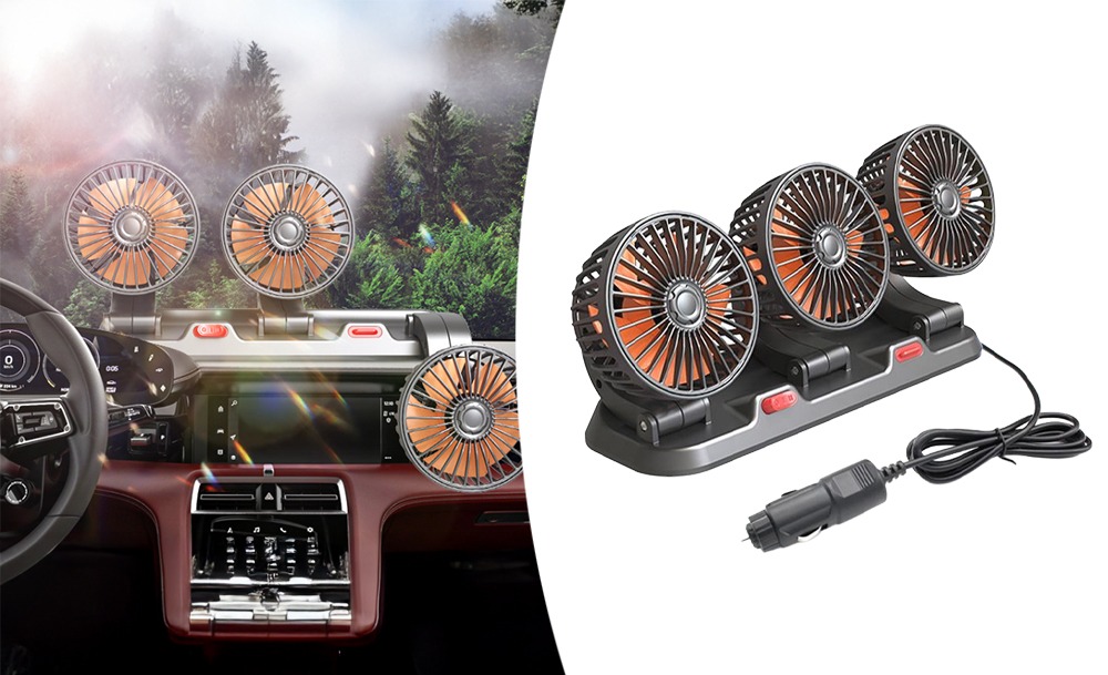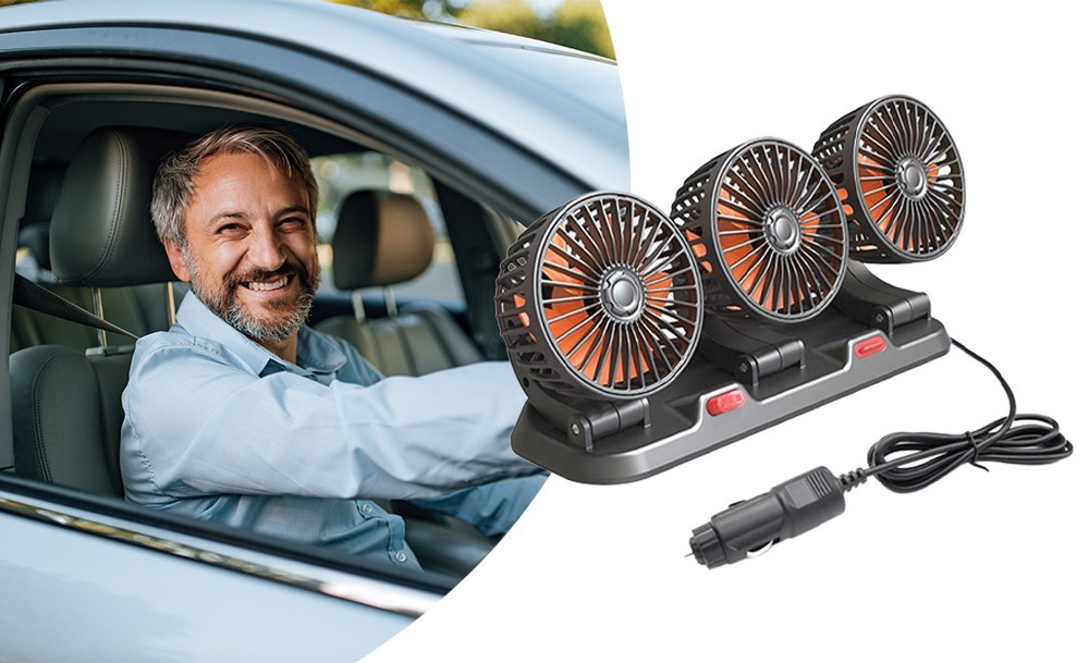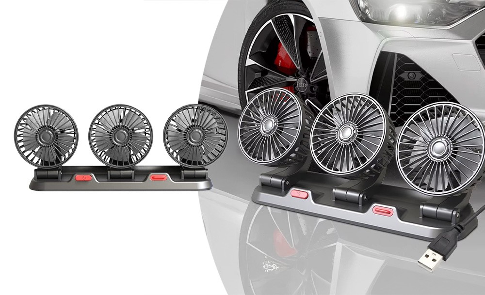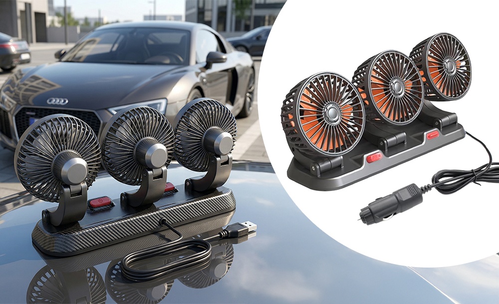 Потрійний автомобільний вентилятор з USB-живленням забезпечує ефективне охолодження салону в спеку. Три потужні прилади створюють рівномірний потік повітря, швидко знижуючи температуру всередині автомобіля. Завдяки повороту на 360° його легко направити в потрібну сторону для максимального комфорту.