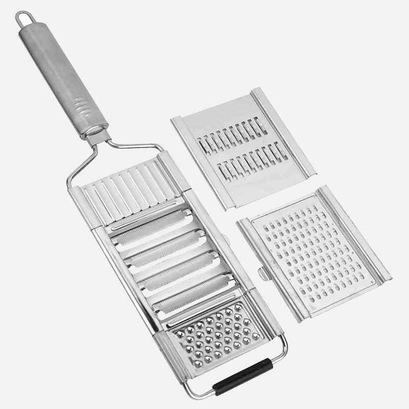 Має 3 робочі насадки з різними поверхнями: дрібними, середніми, великими отворами та ножем для шаткування. Поверхня з дрібними отворами стане в пригоді для натирання картоплі або цедри.